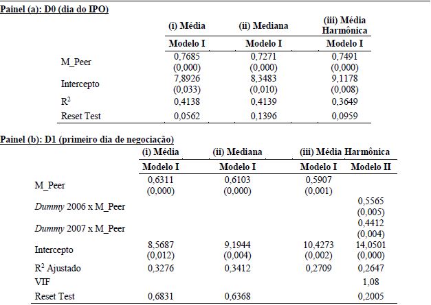 Observa-se, na Tabela 4, que em todos os modelos, os múltiplos das peers mostraram-se significativos (com valores p abaixo de 0,1%). No caso do modelo em D1 a partir da média harmônica, a significância do múltiplo das peers deu-se apenas nos 2 anos em que a iteração da dummy de tempo mostrou-se significativa (2006 e 2007, anos com maior número de IPO’s). Os modelos de média harmônica são os que apresentaram menor fator de ajuste (medido pelo R2), em ambos os dias (D0 e D1). Para D0 (painel (a)), os modelos a partir da média e da mediana apresentam os maiores fatores de ajuste (R2). Para D1 (painel (b)), o melhor fator de ajuste deu-se para o modelo a partir da mediana.