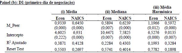 Cada um dos três modelos foi estimado para (a) o dia D0 e (b) o dia D1. Além disto, as variáveis das peers (múltiplo, rentabilidade, alavancagem e tamanho) foram calculadas por meio de três diferentes métodos: (i) a média, (ii) a mediana e (iii) a média harmônica. Como nenhuma dummy de ano nem variável de diferença de driver (rentabilidade, alavancagem e tamanho) foi significativa, a Tabela 4 apresenta apenas o Modelo I. O único Modelo II apresentado justifica-se pela única exceção em que as variáveis dummy de ano mostraram-se significativas: modelo de D1 para média harmônica.