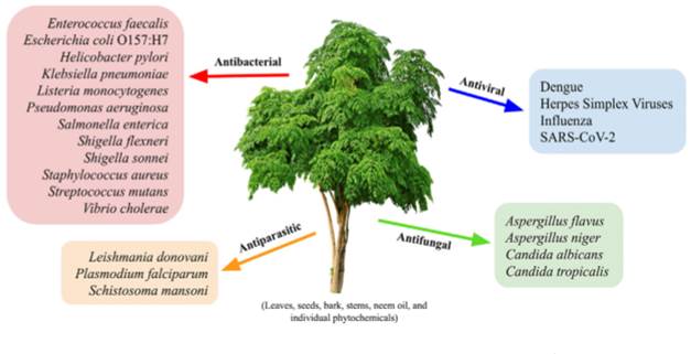 Extractos de este árbol (A. indica) se han utilizado ampliamente como tratamientos para promover la salud desde la antigüedad debido a su amplia variedad de propiedades terapéuticas (Rahmani et al., 2018). Varias partes del árbol se han utilizado durante milenios en la medicina tradicional India por sus supuestas propiedades antipiréticas, antiácidas, antiparasitarias, antibacterianas, antivirales, antidiabéticas, anticonceptivas, antidesmoderméticas, anticancerígenas, antiinflamatorias, antioxidantes, anti-fúngicas, dentales y otras propiedades curativas y protectoras (Alzohairy, 2016; Marina y Scott, 2022) (Figura 2).