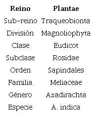 La posición taxonómica de Azadirachta indica (Neem) se clasifica en la Tabla 1 (Uzzaman, 2020).