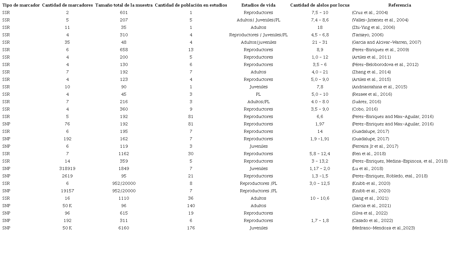 Como parte de los marcadores genéticos, los SSR y SNP son los preferidos para analizar la variabilidad genética y asociación debido a sus propiedades (Cobo, 2016). Una revisión de diferentes estudios sobre la diversidad genética y el análisis de la estructura genética en poblaciones de P. vannamei con el empleo de los marcadores genéticos SSR y SNP (Tabla 1), reveló que el uso reciente de SNP está relacionado a los avances en una secuenciación de nueva generación (NGS), análisis de genotipo, altos niveles de polimorfismos, frecuencias genómicas y heredabilidad codominante de los marcadores SNP. Garcia et al., 2021; Medrano-Mendoza et al. (2023) utilizaron el mayor número de SNP como marcadores genéticos en estudios de diversidad genética, 50 K (50 mil SNP). Esta cantidad de marcadores excedió por mucho los 35 SSR empleados por Garcia y Alcivar-Warren (2007). Para ambos marcadores aumentó el tamaño total de las muestras de los últimos cinco años, de la misma manera que aumentó la cantidad de poblaciones de P. vannamei estudiadas. EL mayor número de estudios se desarrollaron sobre los reproductores, debido a su importancia para obtener resultados satisfactorios en la cadena de producción de los camarones. Garcia y Alcivar-Warren (2007) obtuvieron entre 21 y 31 alelos por locus, con el empleo de 35 marcadores microsatélites, mientras que Lu et al. (2018) obtuvieron entre 1,17 and 2,0 alelos por locus luego del análisis de genotipo 318919 con marcador SNP (Tabla 1).