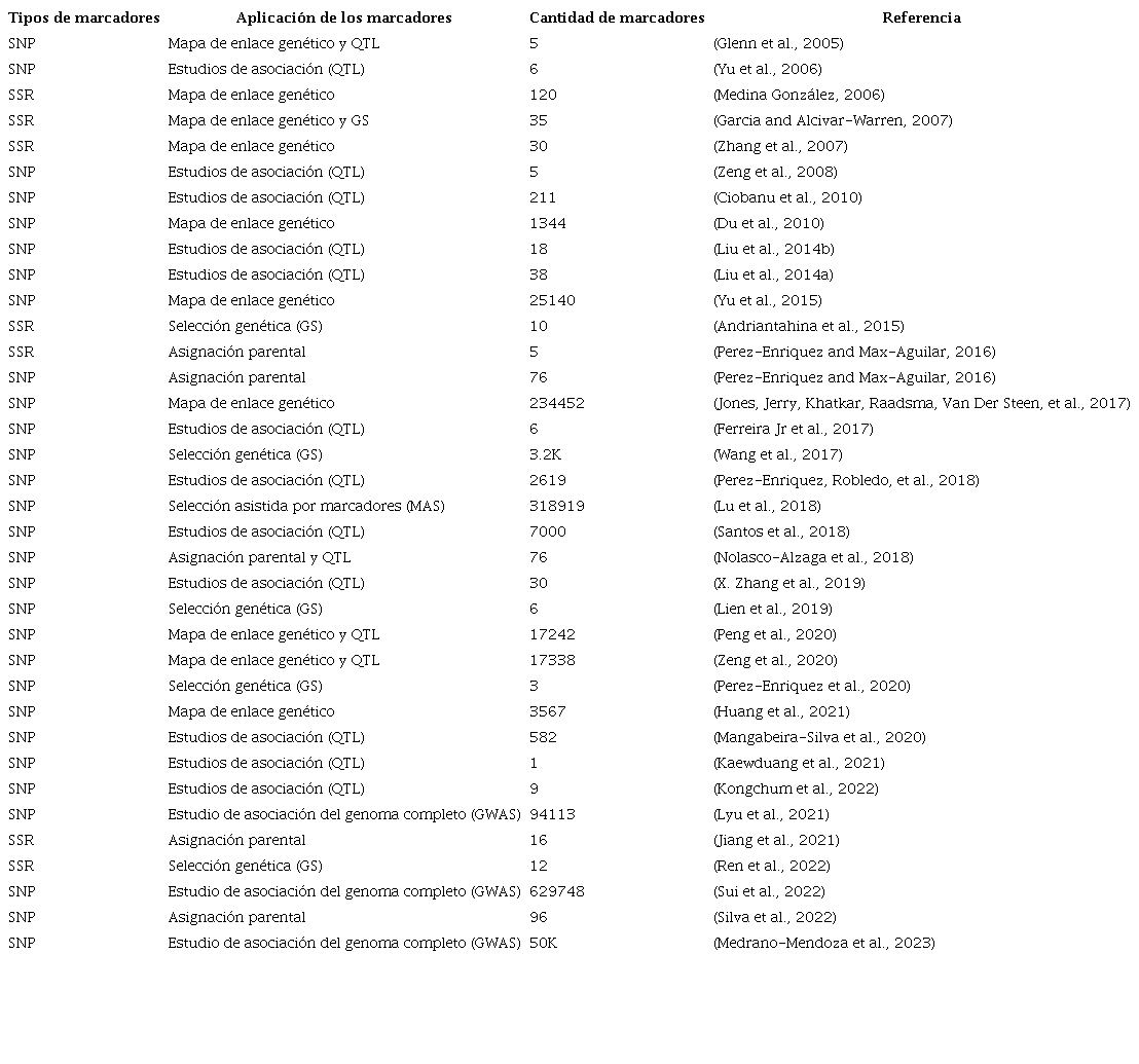 La revisión sobre las diferentes aplicaciones de los marcadores genéticos microsatélites y SNP empleados en P. vannamei para caracterizar las poblaciones (Tabla 2), mostró que el 80,5% de los artículos usaron los SNP como marcadores genéticos, principalmente para crear mapas de enlaces genéticos y los estudios de asociación a través de loci de características quantitativas (QTL). Medina Gonzaléz (2006) emplearon la mayor cantidad de marcadores microsatélites con 120 SSR para generar un mapa de enlace genético del camarón blanco Penaeus vannameicon el empleo de marcadores codominantes. Por otro lado, Jones, Jerry, Khatkar, Raadsma, Steen, et al. (2017) crearon un mapa integral comparativo de enlace de genes, así como un mapa de desequilibrio de enlace para el camarón blanco del Pacífico, con el empleo de un marcador SNP 234452 de alta densidad, mientras que Lu et al. (2018), para identificar marcadores SNP relacionados con la tolerancia a la toxicidad por amoniaco, mediante análisis de genotipo selectivo a partir de un novo ensamblaje de transcriptoma en Penaeus vannamei, emplearon un marcador SNP 318919 de alta densidad, como MAS.