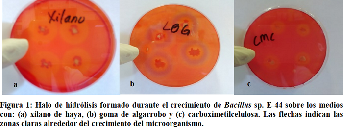 Figura 1) se pueden observar zonas claras alrededor del crecimiento del microorganismo en las placas que contienen xilano, goma de algarrobo y CMC como sustrato, lo cual indica que la bacteria expresó enzimas que despolimerizan el sustrato presente en el medio de cultivo.