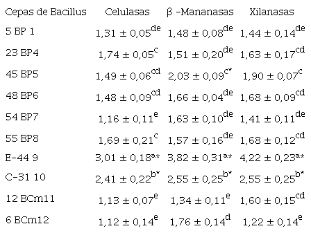 Resultados: De las cepas evaluadas todas mostraron la capacidad de producir las enzimas en estudio. El 23,3% de las actividades enzimáticas estudiadas se consideró como buena. Bacillus subtilis E-44 resultó como la cepa que manifestó la mejor actividad enzimática en los tres sustratos evaluados con índices de potencia de 3,01 ± 1,18; 3,82 ± 0,31 y 4,22 ± 0,23 para celulasas, β-mananasas y xilanasas respectivamente.