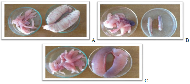 Durante la extirpación de los testículos, se pudo apreciar su aspecto lobular, turgencia y color blanquecino (Figura 1A), asociados con los testículos tipo I o maduros (Mansour et al., 2004) productores de semen de excelente calidad; apariencia similar manifestaron las gónadas masculinas de C. gariepinus silvestres de un lago en Nigeria, durante la época de desove (Ali et al., 2022). Las glándulas genitales accesorias (vesículas seminales) presentaron múltiples lóbulos y produjeron una secreción altamente viscosa y rosada, en correspondencia con lo referido para la familia Clariidae (Van der Hurk, Resink y Peute, 1987; Singh y Joy, 1999).