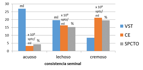 Se observó una relación fisiológica entre la consistencia seminal y el VST, la CE y el SPCTO (Figura 2). El VST se redujo a medida que la consistencia cambió de acuosa a lechosa y cremosa. Se asoció un semen cremoso con la mayor densidad celular (21,14 ± 2,90 x 109/ml y 19,50 ± 1,24 % de SPCTO) en comparación con el semen acuoso (3,27 ± 0,87 x 109/ml y 4,30 ± 1,90 %).
