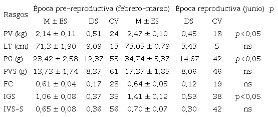Se encontraron diferencias significativas (p<0,05) en los indicadores PV, PG e IGS de los reproductores machos de Clarias gariepinus, a favor de la época reproductiva (Tabla 1).