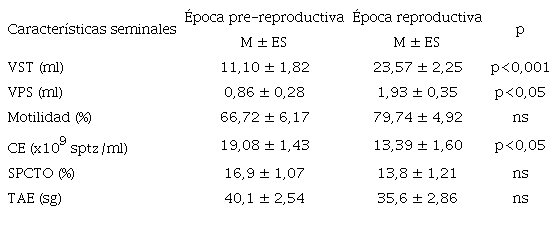 Métodos: Se evaluaron 42 reproductores machos, en ambas épocas, mediante los indicadores peso (PV) (kg), largo (LT) (cm), peso gonadal (PG) y de vesículas seminales (PVS) (g), factor de condición (FC), índices gonadosomático (IGS) y vesículas seminales-somático (IVS-S). Se colectaron muestras de semen testicular (ST) y semen testicular-plasma seminal (ST-PS), con evaluación del color, consistencia, volumen seminal testicular (VST) y del plasma seminal (VPS) (ml), motilidad (%), tiempo de activación espermática (TAE) (sg), concentración espermática (CE) (x109 sptz/ml) y espermatocrito (SPCTO) (%). Se realizó un análisis de varianza de dichas variables considerando la época como fuente de variación y un análisis de correlación de Pearson.