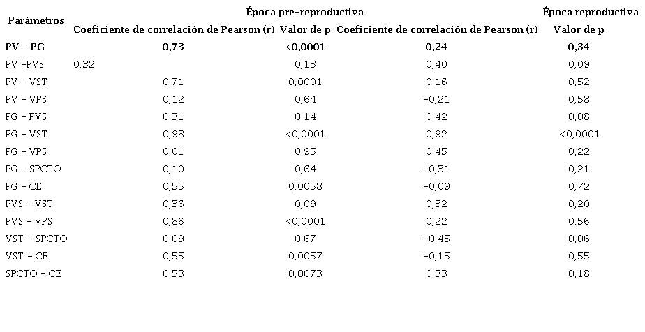 Hubo una correlación alta y significativa (p<0,001) entre PV y VST (r=0,71), PG y VST (r=0,98) y entre el PVS y VPS (r=0,86). Se detectó una correlación moderada y significativa (p<0,01) entre PG y CE (r=0,55), VST y CE (r=0,55) y entre SPCTO y CE (r=0,53). Nuestros hallazgos coinciden con los referidos por Yusuf et al. (2015), quienes encontraron correlaciones positivas pero superiores (r=0,72, p<0,05) del VS y PG con la CE en reproductores machos cultivados en Nigeria y similares entre el PG y VST (r=0,98, p<0,01).