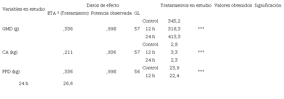 Al evaluar la significación de los tratamientos en las variables en estudio (GMD, CA y PPD) el mayor efecto positivo correspondió a los animales que consumieron pienso fermentado 24 horas con MAM. En este grupo se alcanzaron los mayores valores en ganancia media diaria y peso postdestete con una conversión alimentaria más eficiente. El valor del coeficiente de determinación parcial (ETA2) respalda la influencia del tratamiento en los resultados logrados. La potencia observada en todos los casos fue ampliamente aceptable, superior al 93 % (Tabla 4).