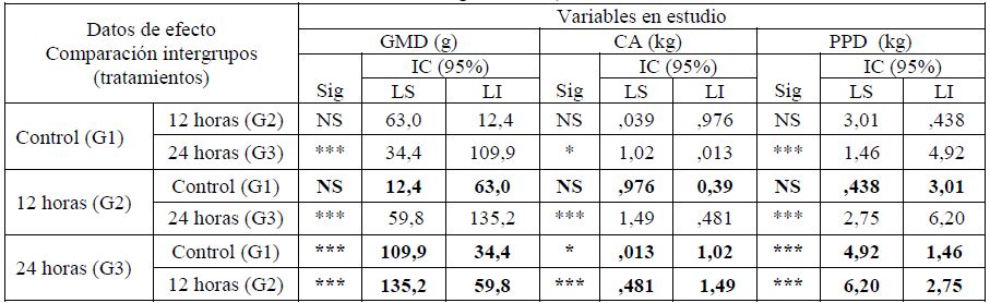 El Test de Comparación Múltiple, en función de la variable independiente tratamiento aplicado, demostró que no hubo diferencias significativas entre los animales del grupo control (G1) y los que consumieron pienso fermentado con MAM durante 12 horas (G2) y sí de ambas variantes con las precebas a las que se ofertó el concentrado fermentado 24 horas (G3).