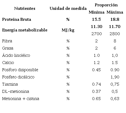 Alimentación de las aves: El alimento consumido se ofreció en forma de harina, una vez al día, en horas tempranas de la mañana. La composición de la dieta (pienso reproductor) se muestra en la tabla 1. Recibieron el agua (ad libitum), tratada con hipoclorito de calcio al 0,1%, mediante tetinas automáticas y el alimento se dispuso en comederos lineales. El concentrado se aplicó a razón de 163 g/ ave al día según la norma establecida por UCAN -IIA (1998).