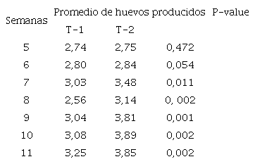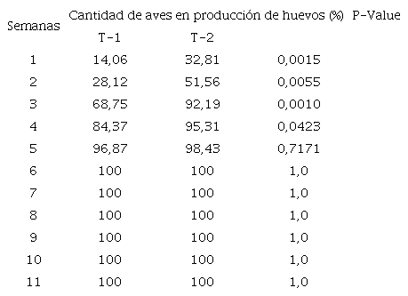 En la tabla 2 se presenta el porciento de aves incorporadas a la reproducción por tratamientos. Se aprecian diferencias durante las cuatro primeras semanas. En este caso el mayor número (P<0,05) de hembras que inician puesta, se corresponde con el grupo que recibió el biopreparado simbiótico en la dieta. En las restantes semanas no se encontraron diferencias entre grupos (T-1 y T-2). Además, se observa como a partir de la quinta semana, el 100% de las aves se encontraban en producción. Ambos grupos logran en el mismo periodo de tiempo (6 semanas) incorporar el total de la masa a la reproducción. Sin embargo, con el uso de PROBIOLEV® se logra incrementar la producción de huevos en las aves que se trataron en relación con el grupo control.
