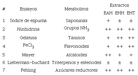 La extracción por maceración (siete días) constituye uno de los métodos más utilizados para la preparación de extractos, al no ser muy agresivo con la muestra, ya que no se aplica calor. Además, es un método efectivo y de simple operación. Según los informes fitoquímicos de la literatura relacionados con la especie, los resultados hasta el momento, plantean la presencia de Triterpenoides (Hernández et al., 2018). Sin embargo, la presencia de estos compuestos en los extractos en estudio es baja. Por otra parte, es notoria la presencia de compuestos fenólicos. Estos compuestos tienen una demostrada actividad antioxidante (Aryal et al., 2019), hepatoprotectora, antitumoral, antiviral, antiinflamatoria, presentan propiedades analgésicas, hemostáticas, entre otras. En la tabla 1 se muestran los resultados del tamizaje fitoquímico.
