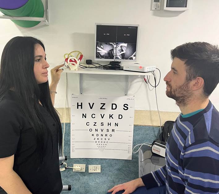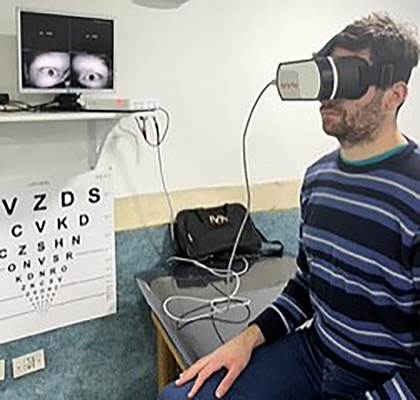 Para remover la fijación visual deben usarse un videonistagmoscopio fabricado en moldura termoplástica ABS que cuenta con cámaras infrarrojas HD 1000TVL, lo cual permite la transmisión en simultáneo y en tiempo real de ambos ojos (Figura 6).