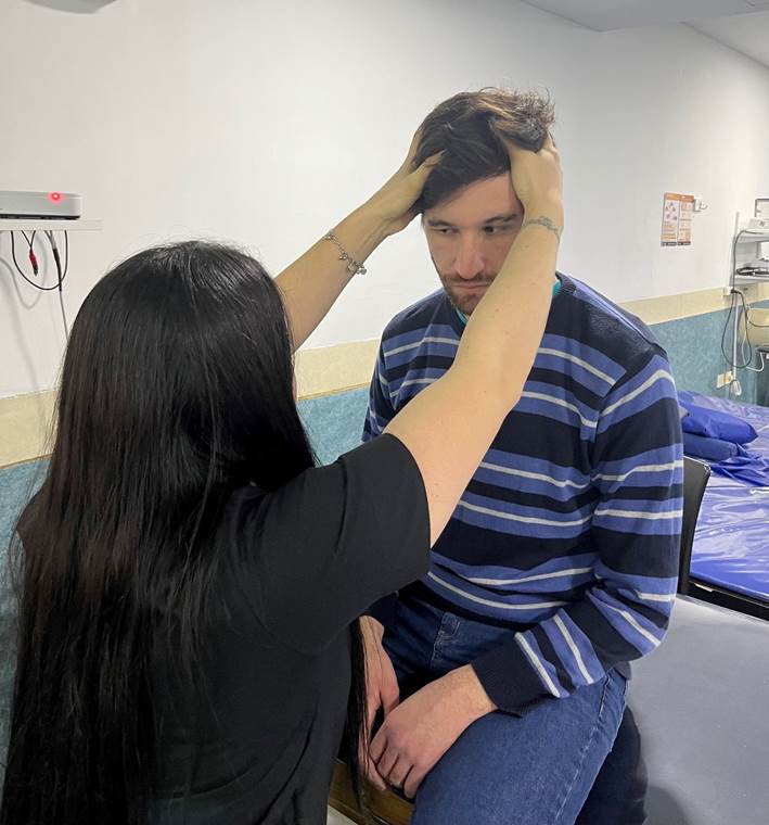 Para realizar el HIT, el evaluador gira la cabeza del paciente de manera abrupta e impredecible en el plano del canal semicircular con una amplitud de 15° en 100 ms mientras el evaluado fija la vista en un punto frente a él, y se observa la respuesta compensatoria instantánea de los ojos (Figura 4). Durante cada impulso cefálico, el movimiento del ojo deberá compensar el giro de cabeza y la mirada deberá quedar fija en el punto de referencia.