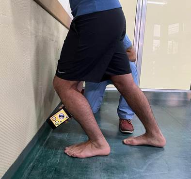 Vohralik utiliza iHandy Level App y describe que, previo a la evaluación, el sujeto debe realizar de forma activa 3 series de 30 segundos de elongación de la pantorrilla. Luego, debe marcarse un punto a 15 centímetros distal a la tuberosidad anterior de la tibia sobre el borde anterior del mismo hueso. El botón de inicio de la rama corta del TI debe marcarse sobre ese punto. El sujeto debe posicionarse frente a una pared, con el pie perpendicular a esta y apoyando sus manos para equilibrarse. El segundo dedo del pie debe estar alineado al centro del talón. Se le instruye al sujeto realizar una estocada hacia adelante llevando su rodilla hacia la pared, sin levantar el talón del suelo. El valor de resultado de dicha medición será el promedio de tres mediciones consecutivas (Figura 2).9