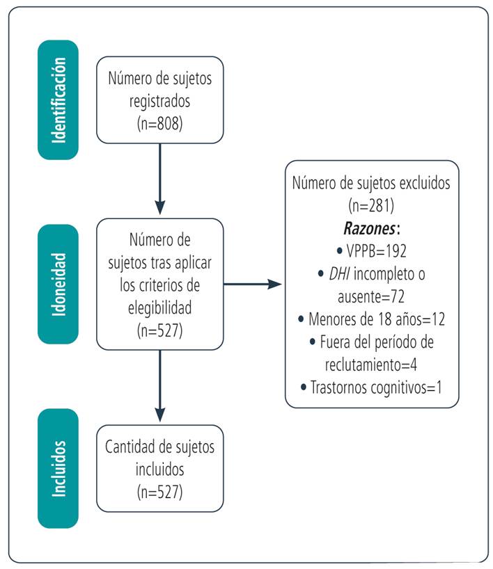 En el período comprendido entre enero de 2011 y marzo de 2021, se incluyeron un total de 808 sujetos, de los cuales 281 fueron excluidos por los siguientes motivos: VPPB (192), menor de 18 años (12), fuera del período de reclutamiento (4), trastornos cognitivos (1) y DHI incompleto o ausente (72) (Figura 1).