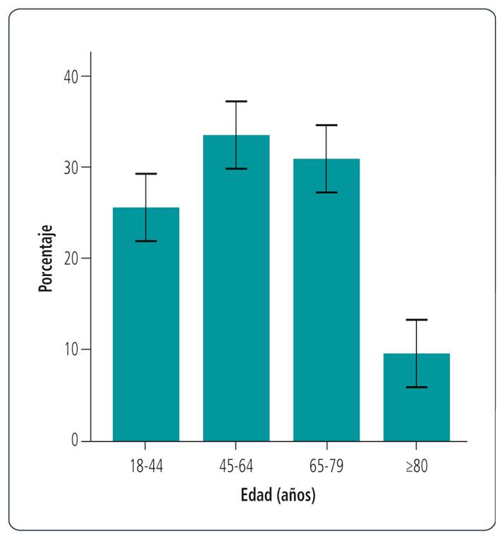 Se incluyeron un total de 527 sujetos, de los cuales 360 (68,3%) eran mujeres y 167 (31,7%) eran hombres. La mediana de edad de la muestra fue de 60 (RIQ 44-72) años. En la Figura 2, se presenta la variable edad según categorías.