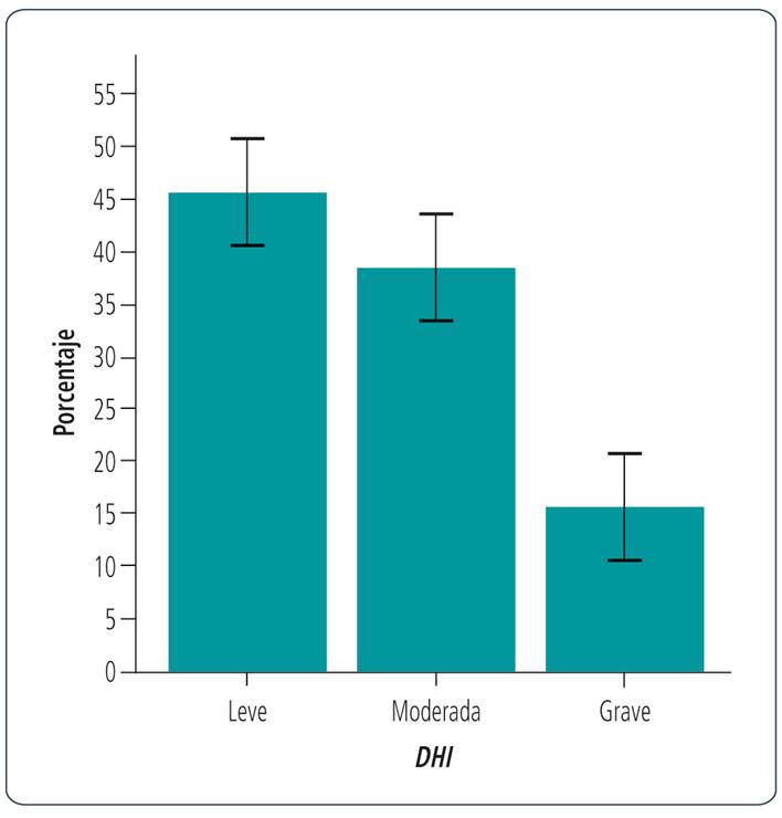 En gran parte de la literatura, se reporta un valor del DHI entre 40 y 50 puntos, lo cual corresponde también a una clasificación moderada.9,11,13,22