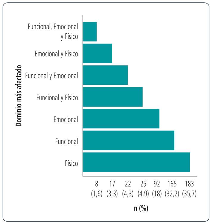 Al analizar la afección de cada dominio de manera aislada, el dominio más afectado resultó ser el físico (35,7%), seguido por el funcional (32,3%) y, por último, el emocional (18%). Estos datos se condicen con los resultados hallados por Ceballos et al., quienes concluyeron que la discapacidad física fue el aspecto más frecuentemente afectado (82%), seguido de la discapacidad funcional (55%) y, en menor medida, la emocional (48%).15 Por otro lado, Silva et al. analizaron una población de adultos mayores y observaron que la edad está fuertemente asociada con un mayor deterioro en los aspectos funcionales frente a los físicos.22 Asimismo, Verdecchia et al. obtuvieron una mediana de aproximadamente 18 puntos en la esfera funcional, 16 puntos en la esfera física y 12 puntos en la esfera emocional.23