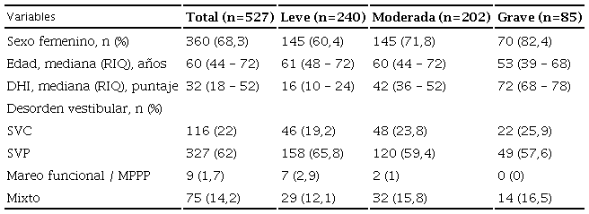 La mediana del puntaje de DHI al ingreso a RV fue de 32 (RIQ 18-52) puntos. De los 527 sujetos analizados; 240 (45,5%) presentaban sintomatología leve; 202 (38,3%), moderada y 85 (16,1%), grave (Figura 3). Las características de los sujetos según el nivel de sintomatología se presentan en la Tabla 1.