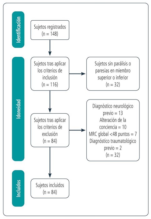 También se excluyeron aquellos sujetos con debilidad adquirida en la terapia intensiva [MRC (siglas en inglés de «Consejo de Investigación Médica») global <48 puntos]13, con presencia de deterioro funcional previo a la afección por la COVID-19 reportado en HC14 y con alteración de la conciencia (por ejemplo, estado de mínima conciencia, síndrome de vigilia sin respuesta y coma).