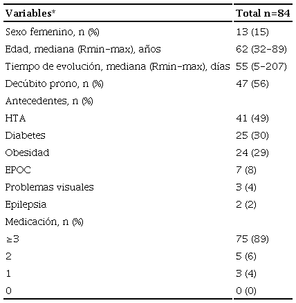 Resultados: Se incluyeron 84 sujetos. El 85% (n=71) fueron hombres, con una mediana de edad de 62 años. La incidencia total de paresias o parálisis focalizadas de grupos musculares de MS y de MI fue del 57% (n=84). El 49% (n=41) de los sujetos presentó hipertensión arterial (HTA); el 30% (n=25) diabetes y el 29% (n=24) obesidad. El 89% (n=75) de los sujetos tomaba 3 o más medicamentos y el 56% (n=47) estuvo en decúbito prono.