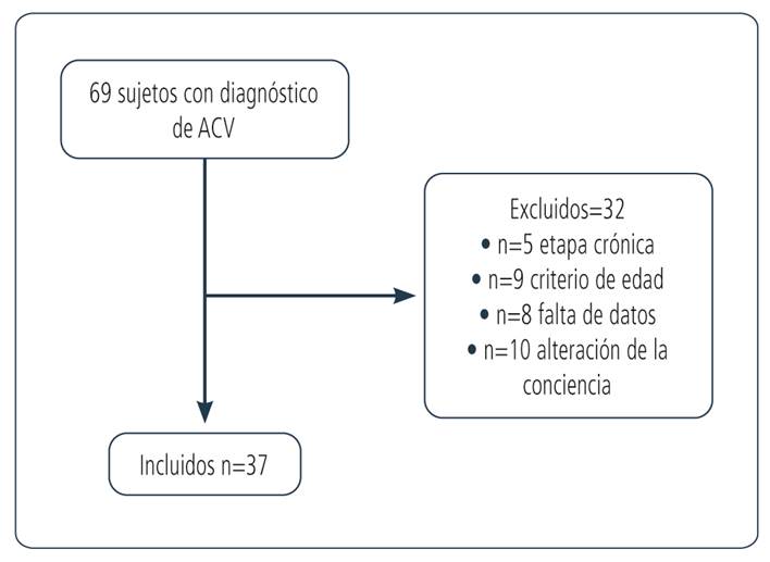 En el período comprendido entre el 1 de febrero de 2005 y el 28 de febrero de 2023 un total de 69 sujetos requirieron internación en nuestra institución para iniciar rehabilitación post ACV. Del total, 32 fueron excluidos, por lo cual la muestra quedó conformada por 37 sujetos. En la Figura 1, se presenta el diagrama de flujo de los sujetos.