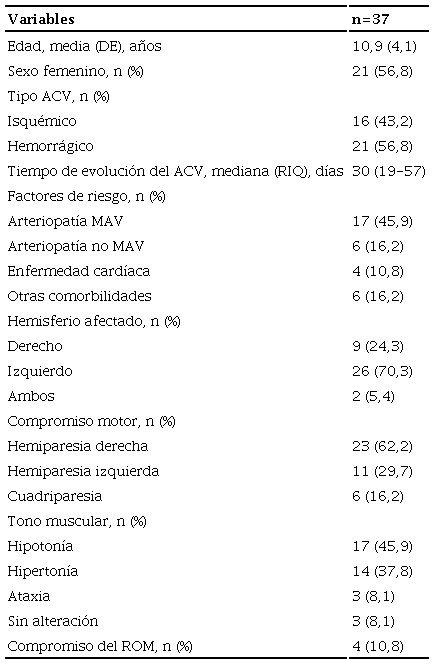 Del total de sujetos, 21/37 (56,8%) fueron mujeres y la media de edad de la muestra fue 10,9 (DE 4,1) años. Al ingreso al centro de rehabilitación, la mediana del tiempo de evolución de la enfermedad fue de 30 (RIQ 19-57) días. Dentro de los factores de riesgo, 17/37 (45,9%) sujetos presentaron ACV secundario a MAV.