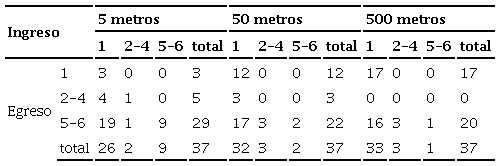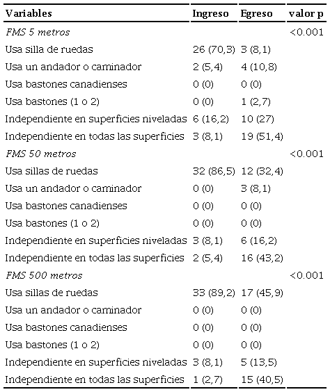 De los 26/37 (70,3%) sujetos que al ingreso utilizaban silla de ruedas para movilizarse en distancia cortas, al egreso 3/26 (11,5%) la continuaron utilizando y 19/26 (73%) lograron una marcha independiente sin ayuda marcha. En las distancias largas, 33/37 (89,2%) sujetos requerían al ingreso silla de ruedas y al egreso 17/33 (51,5%) la continuaron utilizando y 16/33 (48,4%) alcanzaron una marcha independiente sin ayuda marcha. En la Tabla 3, se observa el cambio del requerimiento de ayuda marcha en todas las distancias. Para facilitar la interpretación, los 6 niveles de la FMS fueron agrupados en 3 categorías: 1 (silla de ruedas), 2-4 (independientes con ayuda marcha) y 5-6 (independientes sin ayuda marcha).