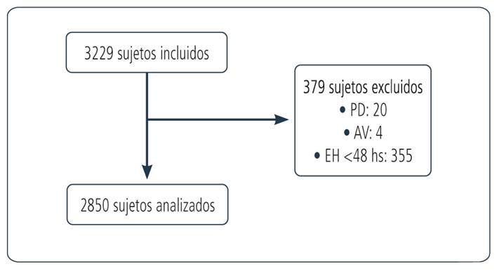 Durante el período comprendido entre el año 2019 y 2022 se incluyeron de manera consecutiva 3229 sujetos, de los cuales se analizaron 2850 debido a criterios de exclusión. El diagrama de flujo se detalla en la Figura 1. La Tabla 1 informa los datos demográficos de la muestra. En el análisis anual, se observó que durante el año 2019 ingresaron 1136 sujetos; en 2020, se registró una reducción de 765 (67,34%) casos; en 2021, de 788 (69,36%) y en 2022, de 441(38,82%). En la Figura 2, se observa el comportamiento de los ingresos mensuales de manera consecutiva, y a partir del 2020 se describe cronológicamente la toma de decisiones sobre las medidas de aislamiento en el marco de la emergencia sanitaria por la COVID-19. En el 2020, los ingresos comenzaron un ascenso en marzo, pero sufrieron un descenso brusco en el mes abril y, posteriormente, un tímido ascenso hacia los meses de mayo, junio, julio, agosto y septiembre, durante los cuales la cantidad de ingresos fue similar a la del mes de marzo. Si bien en el año 2021 el ascenso de los ingresos comenzó también en marzo, el pico se generó entre los meses de julio, agosto, septiembre y octubre. Algo diferente sucedió en 2022, ya que la cantidad de casos tuvo su pico en mayo y se mantuvo constante durante los meses de junio, julio, agosto y septiembre.