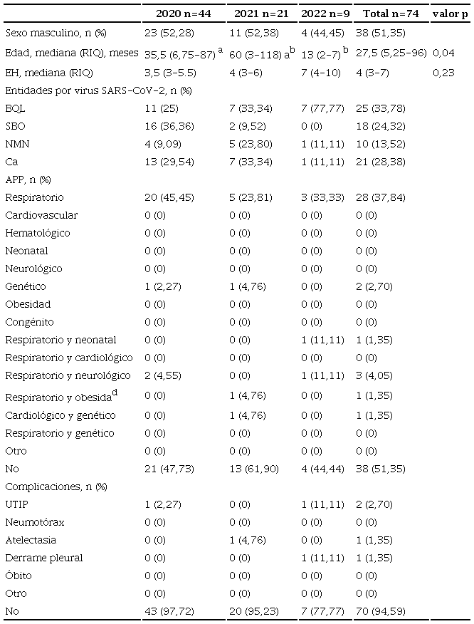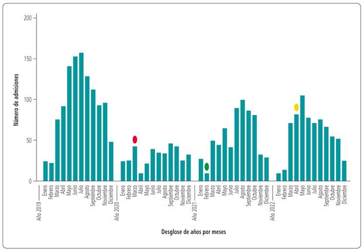 Results: In 2019, 1136 subjects were admitted. In 2020, the number of cases decreased by 765 (67.34%); in 2021, by 788 (69.36%); and in 2022, by 441 (38.82%). The male sex was the most frequent (53.85%). In 2019, the age of the population admitted was lower (17 months) than that of the rest of the periods and the hospital stay in that year was longer (4 days) than in 2020 and 2021. No cases of mortality were recorded. A total of 74 subjects with SARS-CoV-2 respiratory disease were admitted, with a median age of 27.5 months and a median length of stay of 4 days.