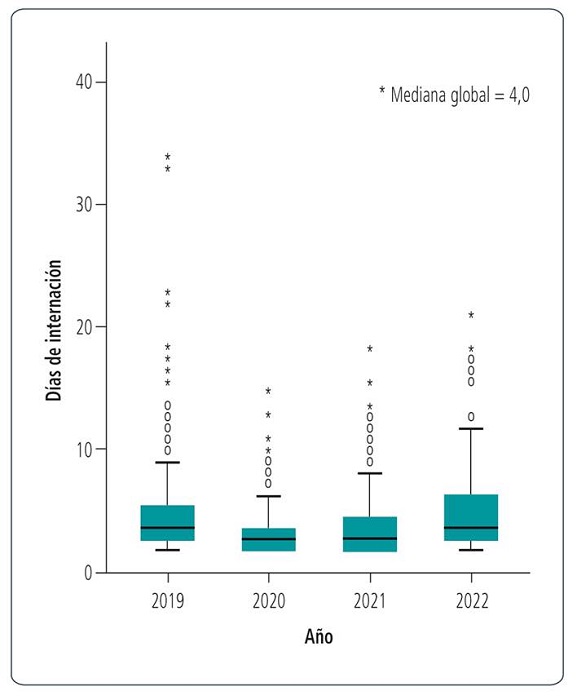 En cuanto a la estadía hospitalaria, la mediana de días de internación global fue de 4 (RIQ: 3-6) días, sin diferencias entre el sexo masculino y femenino: 4 (3-6) días versus 4 (3-6) días, (p= 0,20). La Figura 3 muestra la distribución de los días de internación durante el período analizado.