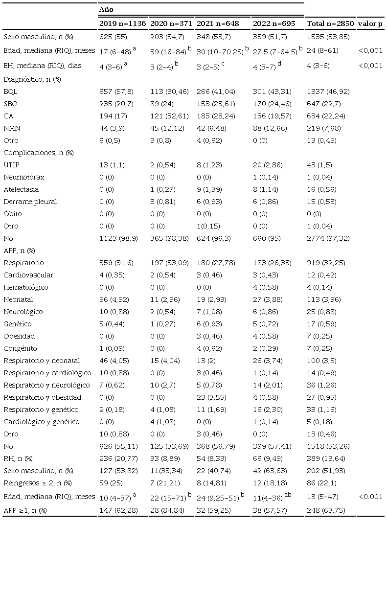Resultados: En 2019, ingresaron 1136 sujetos; en 2020, se redujeron 765 (67,34%) casos; en 2021, 788 (69,36%) y en 2022, 441 (38,82%). El sexo masculino fue el más frecuente (53,85%). En 2019, la edad de la población ingresada fue menor (17 meses) que en el resto de los períodos y la estadía hospitalaria en ese año fue mayor (4 días) que en 2020 y 2021. No se registraron casos de mortalidad. Ingresaron 74 sujetos con enfermedad respiratoria por SARS-CoV-2, con una mediana de edad de 27,5 meses y una mediana de días de internación de 4 días.