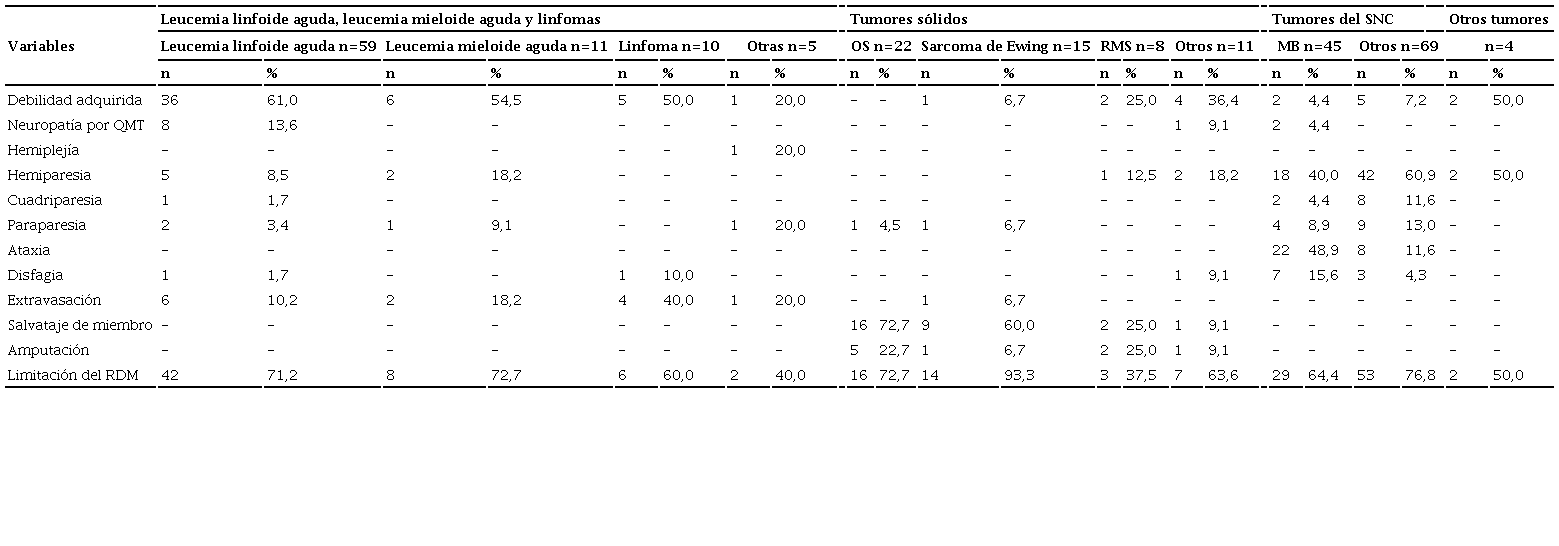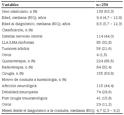 Materials and method: An observational, descriptive, cross-sectional, and retrospective study was conducted on subjects under 18 years of age with oncological pathology who required outpatient treatment and were referred to the physiotherapy service between February 2016 and December 2018. Demographic variables, medical treatment, reasons for referral (limb salvage or amputation, muscle weakness, neuropathy, extravasation of cytostatics, postsurgical motor sequelae), and time elapsed from diagnosis to consultation were collected.