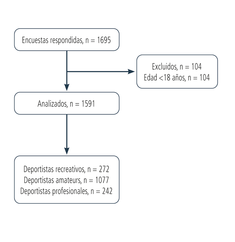 Se recopilaron un total de 1695 respuestas; 104 fueron excluidas por ser de menores de 18 años. Por lo tanto, se incluyeron 1591 atletas en el análisis. De éstos, 272 (17,1%) fueron clasificados como deportistas recreativos, 1077 (67,7%) eran deportistas amateurs y 242 (15,2%) eran deportistas profesionales (Figura 1).