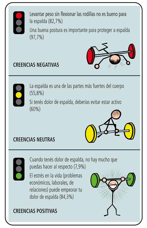 En general, se expresaron creencias mixtas con respecto a la actividad durante un episodio de dolor lumbar. Casi un tercio de los encuestados respondió que deberían evitar los ejercicios si tienen dolor de espalda. Esta concepción está en línea con la evidencia más reciente que muestra que mantenerse físicamente activo cuando se experimenta dolor de espalda disminuye la intensidad del dolor, el ausentismo laboral y aumenta la función.53 Sin embargo, a diferencia de la afirmación anterior, sólo el 60% pensaba que “si tienes dolor de espalda deberías intentar mantenerte activo”. Este porcentaje es similar al de la población argentina (65,3%) pero muy inferior al de la población general de Nueva Zelanda (80%).14,16