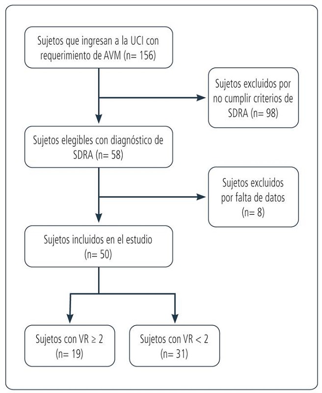 Durante el período de estudio ingresaron 156 sujetos a nuestra UCI. De ellos, 58 cumplieron el criterio de inclusión y 50 se incluyeron para el análisis final. De los 50 sujetos incluidos, 19 tuvieron un VR alto (Figura).