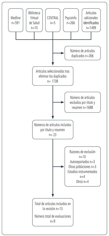 No hubo límite temporal ni idiomático y se incluyeron artículos publicados hasta el 12 de octubre de 2021. Las bases que se consultaron fueron Medline, biblioteca virtual de salud, registro Cochrane central de ensayos controlados y PsycINFO.