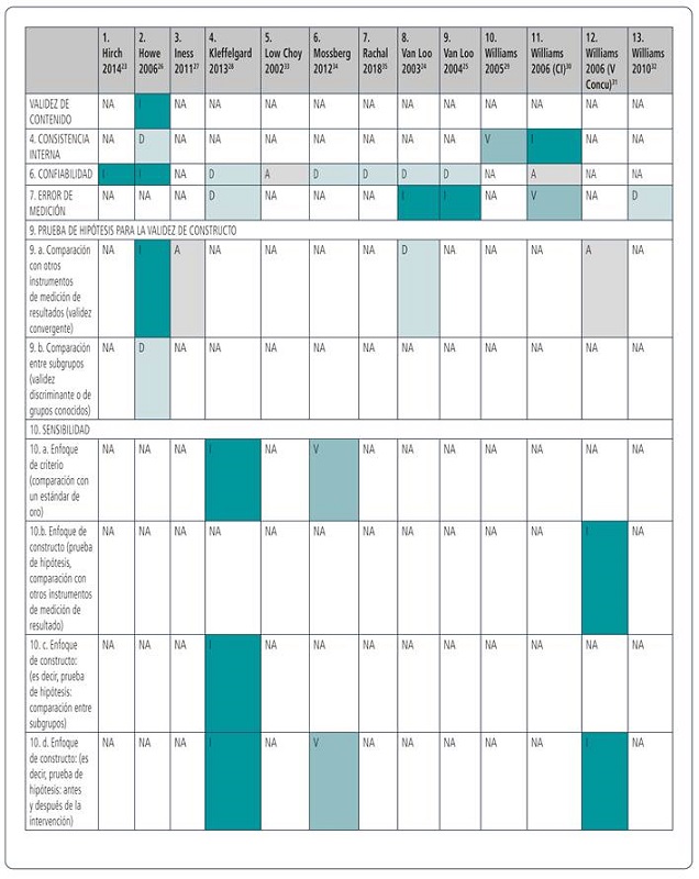 De las 9 medidas de desempeño incluidas, las propiedades psicométricas que se analizaron fueron confiabilidad, consistencia interna, error de medición, validez de constructo, validez de contenido y sensibilidad al cambio, de las cuales la primera fue la propiedad más valorada.