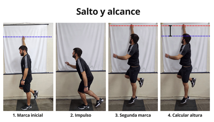 Por otro lado, también se puede evaluar el salto mediante la prueba de salto y alcance, que solo requiere algún material para colorear los dedos de la mano del sujeto y un centímetro para medir la diferencia entre dos marcas en la pared.7,9)