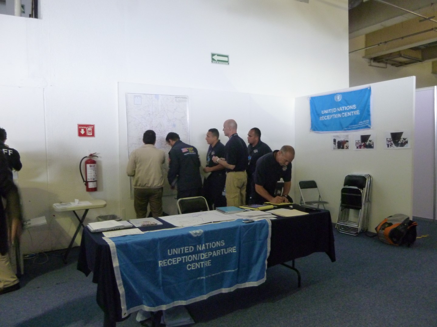 Chacun de ces sigles renvoie à la dénomination internationale produite par le réseau de secouristes internationaux INSARAG2 qui depuis les années 1990 travaille à produire codes et classifications pour standardiser les modes d’intervention des secouristes dans le monde. Dans un coin, une table surmontée d’un drapeau bleu annonçait “United Nations Reception Center” (Image 1). Une autre table lui faisait face, représentant la douane du pays, derrière laquelle deux douaniers attendaient l’arrivée des secouristes pour appliquer les protocoles d’entrée sur le territoire mexicain des équipes internationales.
