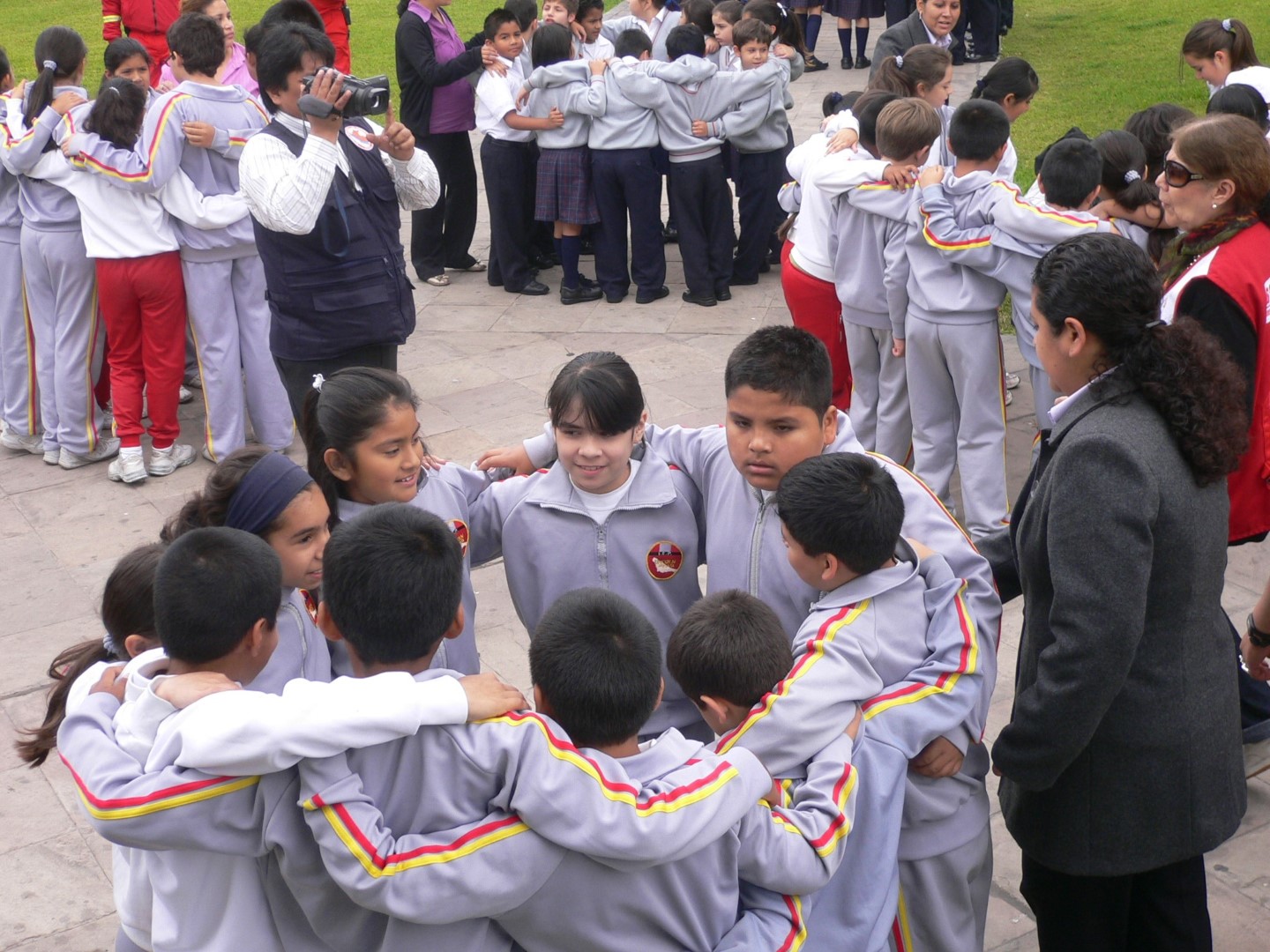 Des enfants évacués se regroupent en cercles lors d’un exercice de simulation au Pérou en 2010 (Photo de l’auteure)