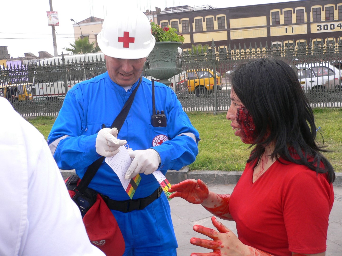 Lors d’une simulation au Pérou en 2010, une femme jouant une victime plaisante avec un secouriste qui lui procure son diagnostic vital (Photo de l’auteure)