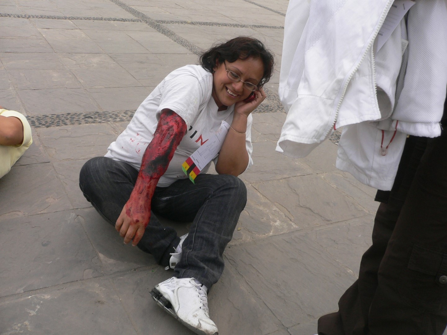 Une femme jouant une victime lors d’une simulation au Pérou en 2010 plaisante au téléphone avec une amie (Photo de l’auteure)