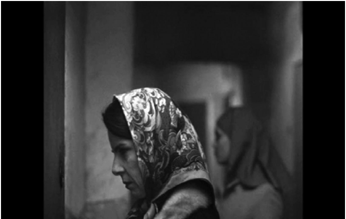Si se analiza el primer plano de una de las primeras secuencias de la película pueden atisbarse algunos de los leitmotifs visuales adoptados por Pawlikowski en Ida. Se aprecia al personaje de Wanda aproximándose hacia la cámara y justo detrás le sigue Ida. El fondo permanece difuminado, focalizando la atención visual en el personaje de Wanda. De este modo, se enfatiza en la idea de que Wanda es la protagonista activa en ese momento, e Ida aparece difuminada en el fondo. El primer plano de perfil recoge la expresión de Wanda forcejeando con la puerta, y la angulación neutra deja un aire considerable sobre sus cabezas. Esta es una de las claves visuales del film, el aire vertical e incluso horizontal. Los personajes no llenan por completo el encuadre, siempre hay una carencia de espacio a su alrededor que contribuye a retratar psicológicamente la ausencia (ver imagen 1).