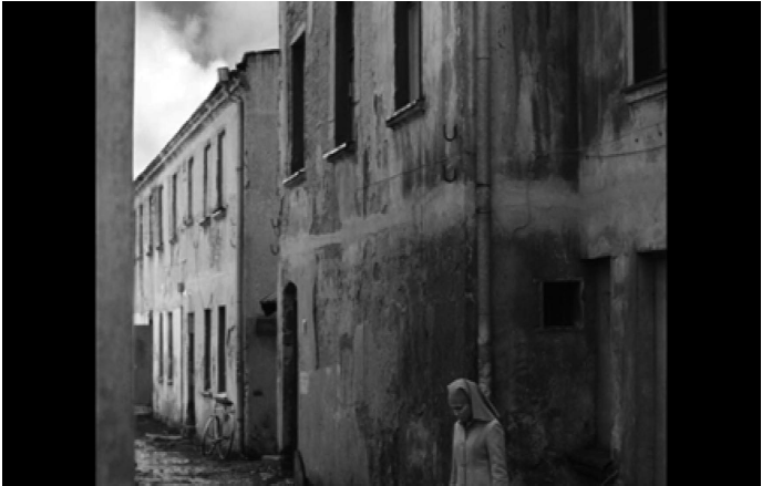 La siguiente escena reafirma algunos de estos propósitos visuales. Ida se encuentra paseando en la calle exterior de la calle esperando a que llegue Wanda. Nuevamente destaca la cantidad de aire que existe por encima del personaje. El plano general presenta una angulación un tanto aberrante pese a ser horizontal, ya que el punto de referencia visual se sitúa en los edificios más que en los personajes (ver imagen 2). La composición vuelve a caracterizarse por un marcado estatismo. El fondo no se encuentra difuminado pese a que los dos personajes entablan una conversación. En este sentido, Pawlikowski quiere enfatizar la relación del personaje con su entorno. La ausencia de movimientos de cámara debe complementarse con alguna clase de movilidad en la composición. Ida se desplaza nerviosa, mientras que el fondo permanece casi inalterado. Las nubes apenas se desplazan, un vecino entra al fondo en una casa. Al igual que en la escena anterior el movimiento del personaje y el aire a su alrededor son los detonantes psicológicos de la acción. El lenguaje audiovisual se construye de tal modo que la ausencia dice más que la presencia, la ausencia de movimientos de cámara y el fondo sustituye a los movimientos de cámara y las angulaciones expresivas tales como la vista de pájaro o el punto de vista subjetivo. Wanda fuma un cigarrillo, el fondo vuelve a difuminarse, el aire y el difuminado aíslan la figura humana, resaltando a través de primeros planos intimistas el gesto dramático de los personajes.