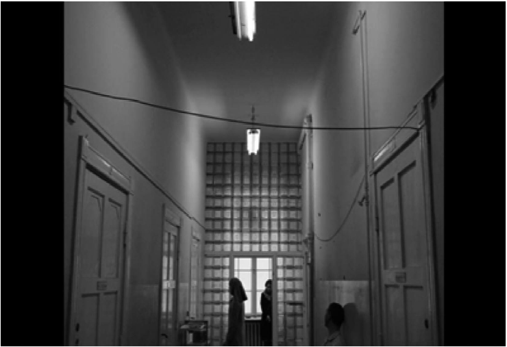 La siguiente escena comienza con otro plano de Wanda fumando, cabizbaja. No hay movimiento de cámara, la angulación es neutra. Un plano general como el anterior de los edificios. La composición es aséptica, Ida no se caracteriza por el barroquismo visual de otros directores polacos como Haas o Polanski. La angulación presenta un cierto escorzo vertical. La regla de los tercios, que hasta ahora no se ha respetado, sigue ausente. El encuadre corta a los personajes de manera poco ortodoxa, sin respetar las líneas del cuerpo —hombros, cintura—, y el punto de fuga no converge, sino que el centro de la composición se pierde en la pared acristalada. La relación entre el fondo y los personajes adquiere nuevamente una significación expresiva vital. Las líneas trazadas por los elementos arquitectónicos —paredes, ventanas— invaden la figura humana como en el caso de Wanda. Líneas perpendiculares y rectas dominan el encuadre; los cables, las puertas y las lámparas sobre los personajes les encierran y aíslan visualmente, relegándolos zonas de atención visuales que no respetan los tercios (ver imagen 3).