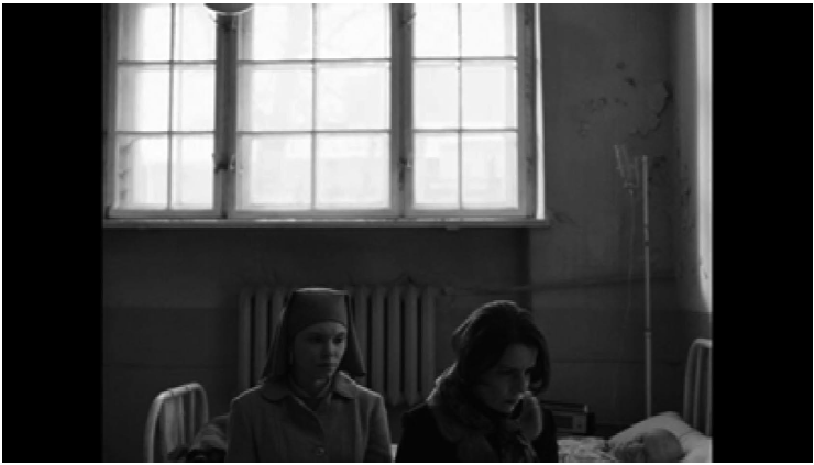 La escena en la habitación del hospital continúa con el mismo discurso cinematográfico. Se trata de un diálogo entre tres personajes. La norma cinematográfica dictaría que debe existir un plano y un contraplano en un diálogo, con algún plano medio de escorzo o un plano de espalda que revele la posición de los personajes y muestre que se encuentre próximos. Ida vuelve a romper estos códigos visuales, ya que cuando Wanda pregunta al presunto asesino de sus padres —se muestra a este personaje a través de un plano picado de perfil, algo escorado y mal encuadrado—, si bien se nos muestra ese contraplano, el siguiente contraplano no muestra a Wanda, sino un plano medio con un inmenso aire superior. Precisamente ese plano donde aparecen Ida y Wanda añade información adicional sobre la trascendencia psicológica de la escena. Además de volver a enfatizar la ausencia a través del aire, la iluminación proviene de una fuente superior, de las ventanas (ver imagen 4), y baña la estancia confiriendo al rostro de los personajes de una pátina de luces y sombras expresionistas, realzando la fuerza dramática del instante.